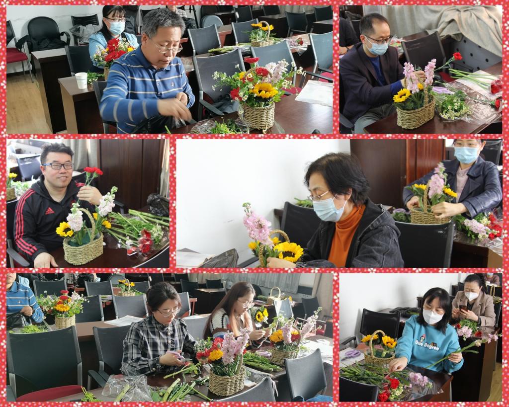 春䁔花开,寓意生活更加美好。在活动现场,老师们在一簇簇鲜花的芬芳中走入了插花世界。插花是一门高雅艺术,内涵丰富,学问不小。学院邀请的花艺师结合花艺知识与插花技巧进行了现场演示和指导。老师们一边仔细聆听花艺老师所讲授的插花技巧,一边按照自己对美的理解,利用手边的花材亲手实践,以花枝表达情韵。老师们细细琢磨,观赏设计,在相互沟通,交流启发中,放松了身心,丰富了审美情趣,增进了情谊,提升了幸福感。当一盆盆由老师们亲手制造的、错落有致、精致盎然的花篮作品呈现在众人面前时,大家互相观赏,爱不释手,纷纷拿出手机拍照,合影,共同记录这美好时刻,喜悦之情溢于言表。活动在轻松愉快的氛围中结束。