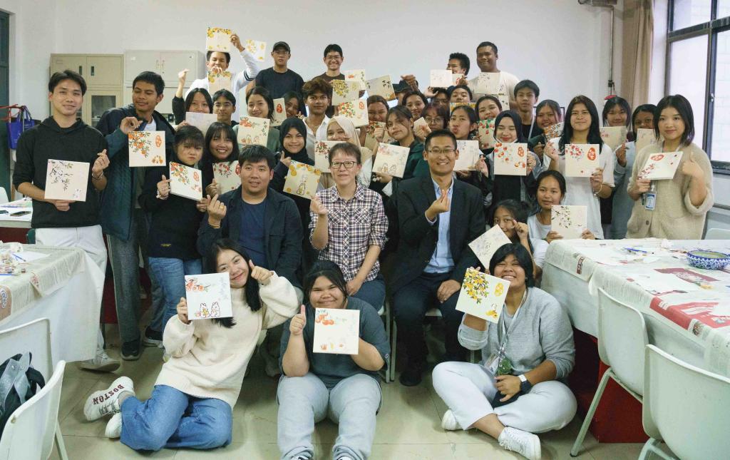 泰国交流生们认真听取张方老师的讲解,并在张老师指导下非常专注于自己的手绘作品,最后都收获了满意的文化体验。