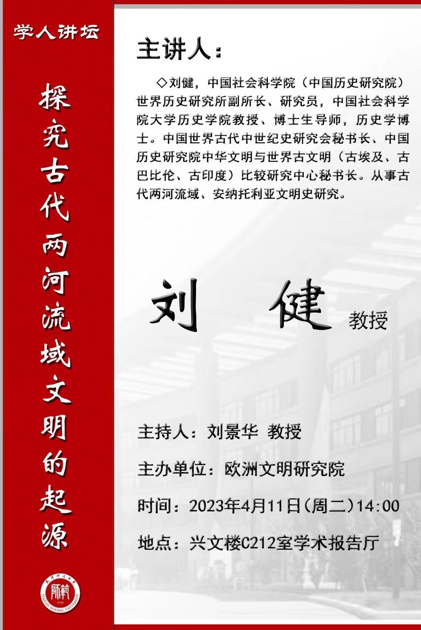 2023年4月11日,刘健教授将为两院师生带来题为《探究古代两河流域文明的起源》的学术讲座,讲座详情见海报。