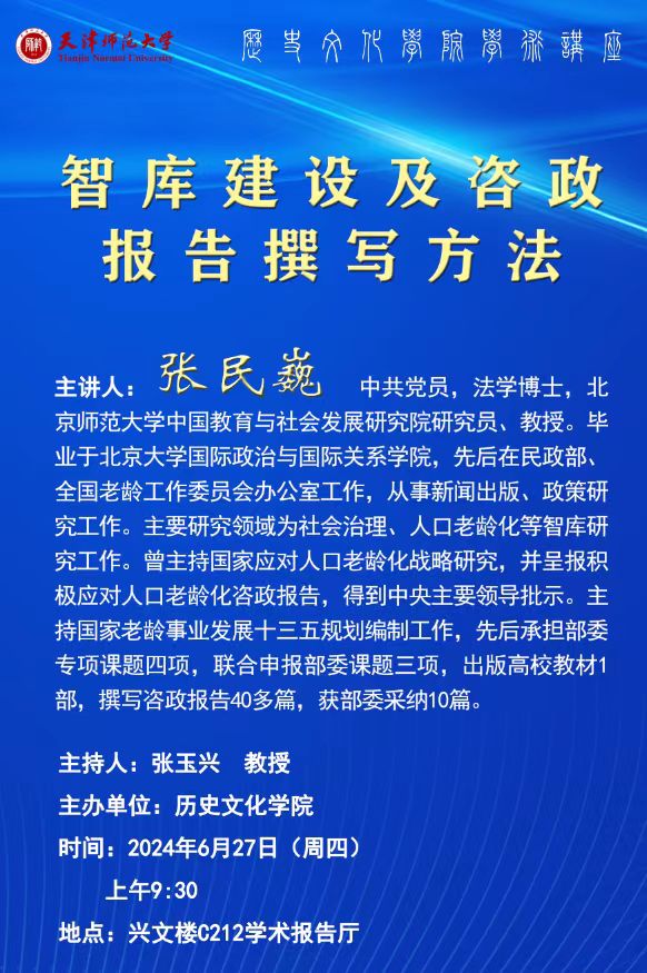 2024年6月27日,张民巍教授将为两院师生带来题为《智库建设及咨政报告撰写方法》的学术讲座,讲座详情见海报。