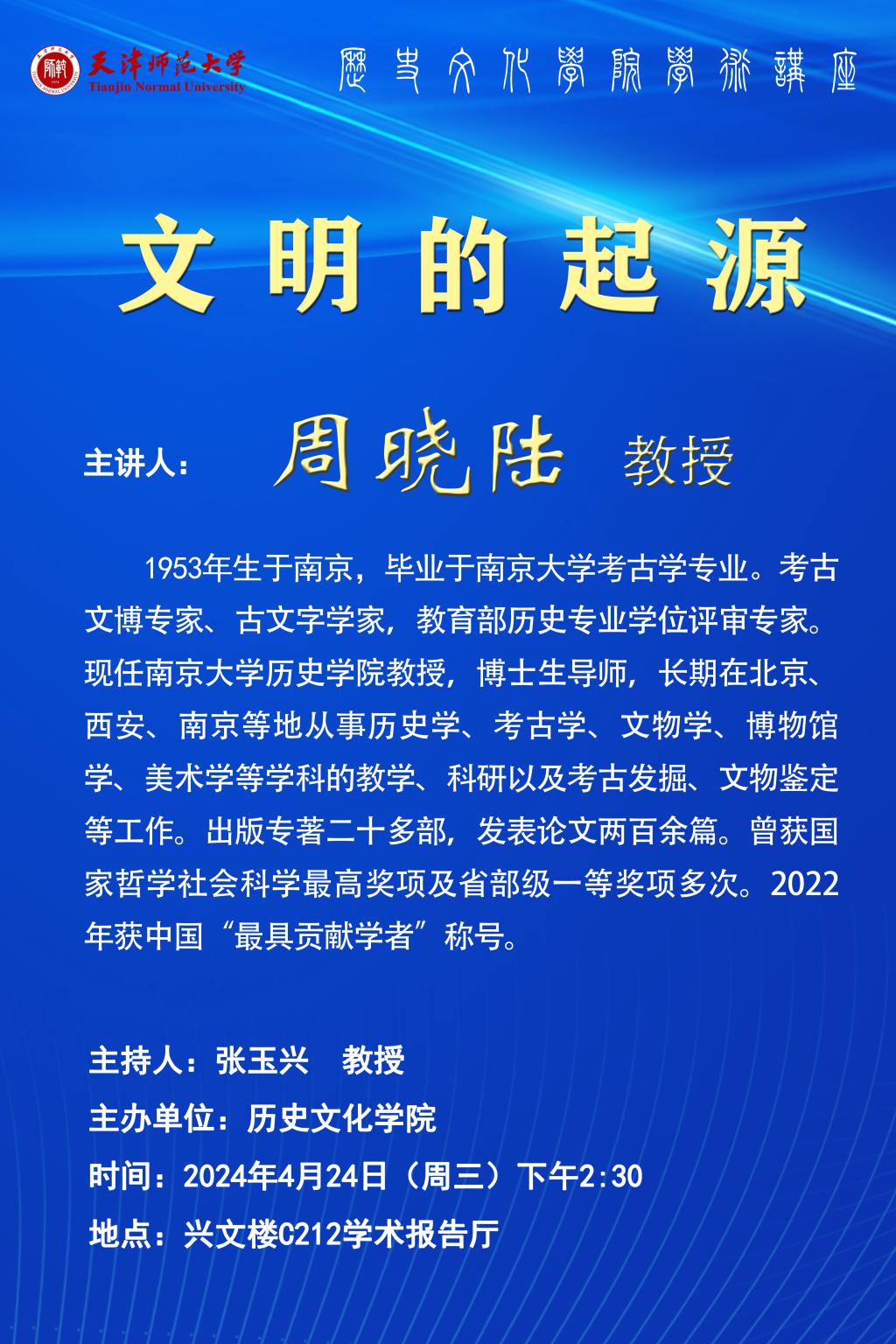 2024年4月24日,周晓陆教授将为两院师生带来题为《文明的起源》的学术讲座,讲座详情见海报。