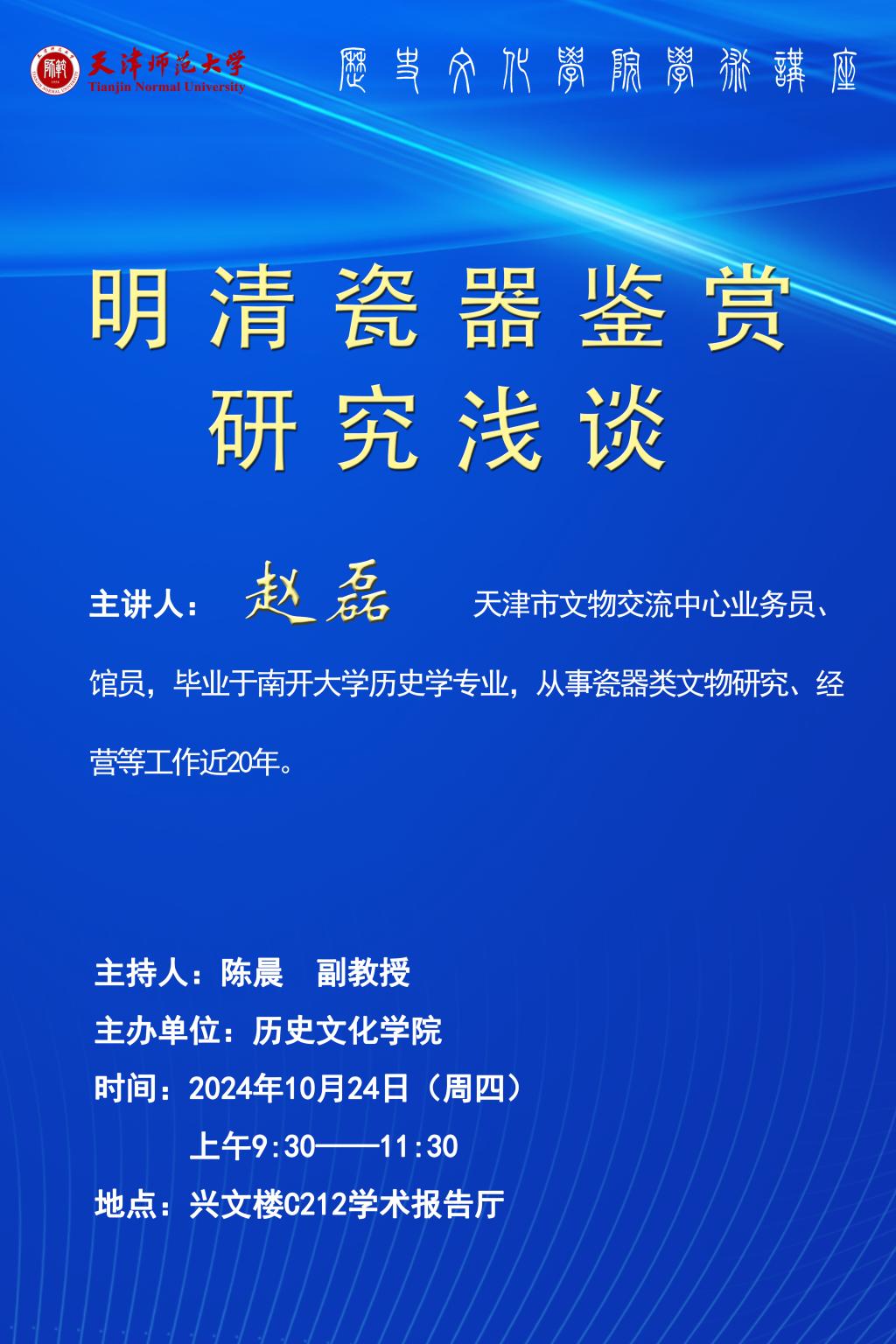2024年10月24日,赵磊馆员将为师生带来题为《明清瓷器鉴赏研究浅谈》的学术讲座,详情见海报。