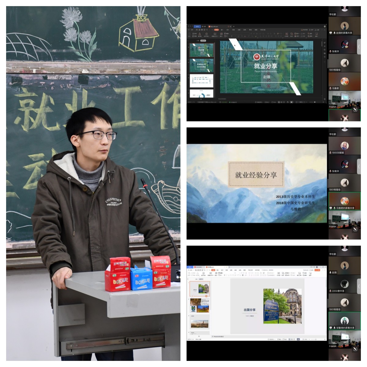 接着,由beat365官方网站优秀院友作就业求职经验分享。本次毕业生就业工作推进会邀请到邵康(2022届中国史专业硕士毕业生,现就职于天津市第六十三中学)、马雅君(2021届中国史专业硕士毕业生,现就职于天津市第二中学)、赵微(2022届文博专业本科毕业生,现就职于西青区文化和旅游局)、邹馨漪(2022届世界史专业本科毕业生,现就读于格拉斯哥大学)四位优秀院友,分别从教师招聘、事业单位和企业应聘以及出国留学等方面与毕业生们分享了经验和体会,并建议毕业生们应对未来方向有明确的自我规划,有清晰的职业规划,明确了自己的目标,才能充分发挥历史学优势,扬长避短;同时应积极调整心态,放放宽视野,实现多渠道就业。