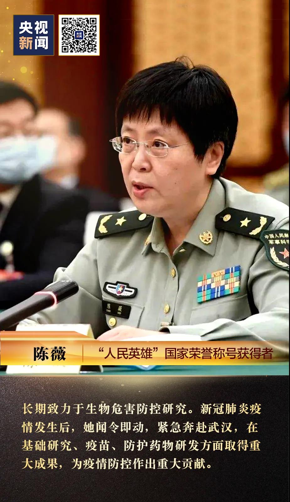 2020年8月9日上午,全国抗击新冠肺炎疫情表彰大会在北京人民大会堂隆重举行,一位获得“人民英雄”国家荣誉称号的女性备受关注,她就是陈薇。当天,一头短发的她身着军装,迈着正步走入人民大会堂。习近平总书记亲自为她颁授勋章并合影。