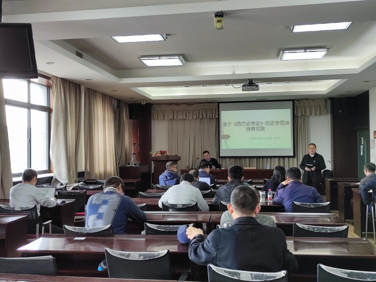 李友东教授结合他的《<外国史学史>课程史学思维培育模式研究》项目同与会老师分享了立项经验和研究心得。在市级课程改革项目中,他尝试以《西方史学史》课程为载体,基于史学原著选读,提炼史家的写作结构作为学生的写作支架,并辅之以相应练习,从而提升学生的史学写作思维能力。他认为,无论是从国家对高等教育的创新要求,大众对历史作品的美学需求,学生的多样性就业需要,还是从史学日益重视非虚构叙事的发展趋势来看,在写作训练中,都需要均衡发展学生的理性科学分析和感性人文叙事等两方面能力。因此有必要在史学史教学中,开展理性分析和非虚构叙事相结合的写作训练。李友东教授还结合国内外史学写作的趋势与变化,结合自己的《西方史学史》的教学设计,谈了自己的实践体会。